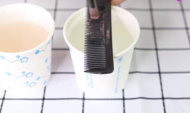 (一杯清水、一杯放入洗發(fā)露,把刷子在水中清洗一次再用梳子來回摩擦)